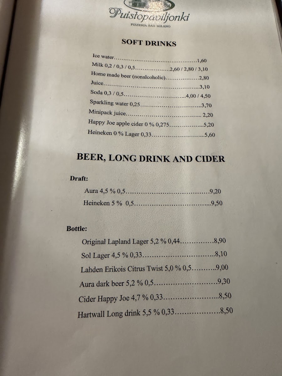 Pizzeria San Milano offers a diverse and enticing menu, blending classic favorites with creative twists. For those seeking a refreshing drink, options like Jaffa Appelsiini 0,5l and Pepsi Max 0,5l are available, as well as various fruit-flavored Mehukatti juices, including Trip Vadelma, Trip Päärynä, and Trip Mansikka. The burger section includes options such as the Kana-Vuohenjuustoburger Ja Bataattiranskalaiset, the indulgent Juusto-Pekoniburger Ja Ranskalaiset, and the hefty Jättiburgeri Ja Ranskalaiset. A range of dips like Aioli, Chilihilloke, and Mango-CurryDressing pair perfectly with the burgers. For those in the mood for wraps, Kanarulla, Kebabrulla, and Pororulla provide savory choices. Fresh and light, the salad menu features the Lohisalaatti and Kana-Vuohenjuustosalaatti. When it comes to pizza, Pizzeria San Milano showcases favorites like Capricciosa, Vegetaria, SpecialeSiena, and Pizza De La Viki, each offering a delightful combination of toppings. The Erikoispizzalista takes things further with unique creations such as the Mexicano, Mozzarella E Pepperoni, and Vegano pizzas. For the little ones, the Lasten Lista offers kid-friendly meals like the Juustohampurilainen Ja Ranskalaiset and Lihapullat, ensuring everyone in the family finds something to enjoy. Whether you're in the mood for a hearty burger, fresh salad, or a classic pizza, Pizzeria San Milano has something to satisfy every taste.